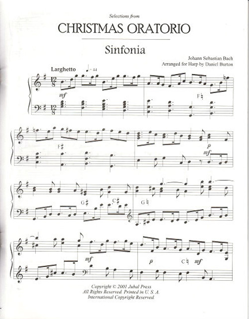 Bach, Johann Sebastian: Selections from Christmas Oratorio, arranged for harp by Daniel Burton. Jubal Press/Vanderbilt Music edition. (Intermediate).