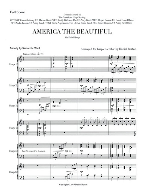 America the Beautiful for Six Harps, arranged by Daniel Burton. Includes score and six harp parts. (Digital Download)