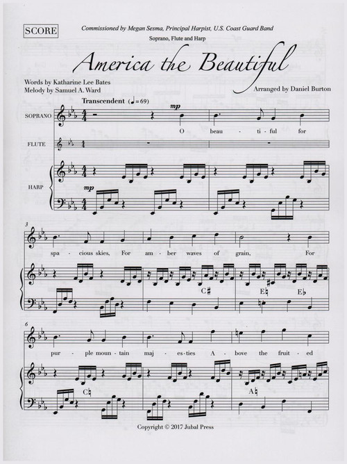 America the Beautiful (Soprano, Flute & Harp), arranged by Daniel Burton. Includes parts for flute and harp.