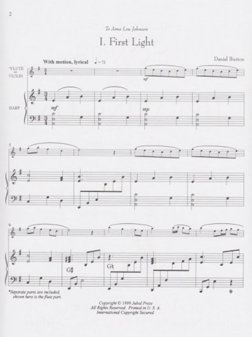 Burton, Daniel: Songs for the Breaking Day, for Flute or Violin and Harp. Includes score and separate flute and violin parts. Jubal Press/Vanderbilt Music edition. (Intermediate)