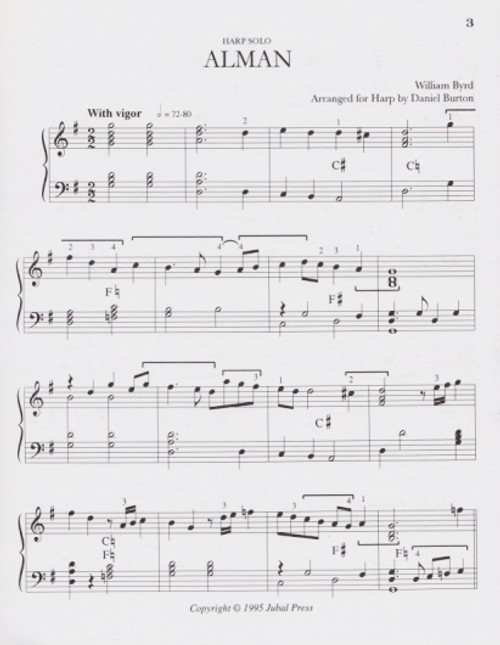 Byrd, William: Elizabethan Dances, Selections from the Fitzwilliam Virginal Book, arranged for harp by Daniel Burton. Jubal Press/Vanderbilt Music edition. (Intermediate)