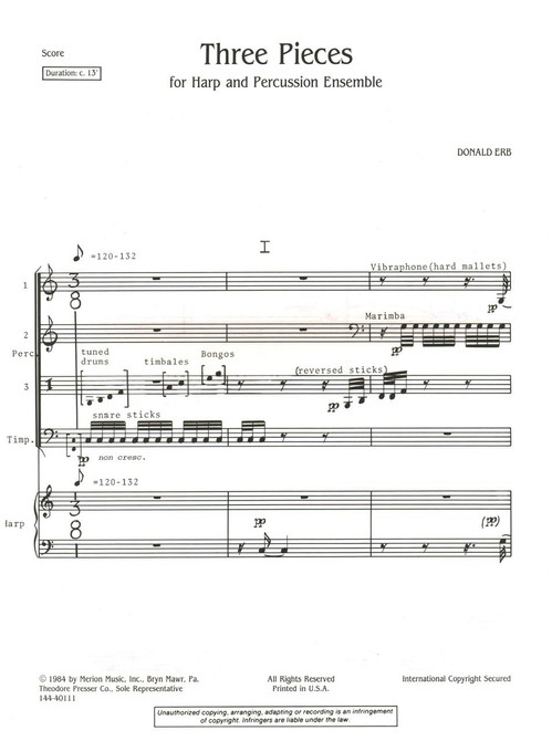 Description Three Pieces for Harp and Percussion Ensemble by Donald Erb. Score and parts are included.