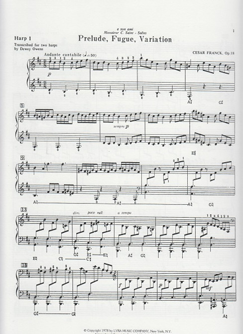Franck, Cesar: Prelude, Fugue, Variation, Op. 18. Transcribed for two harps by Dewey Owens. Lyra Music edition.