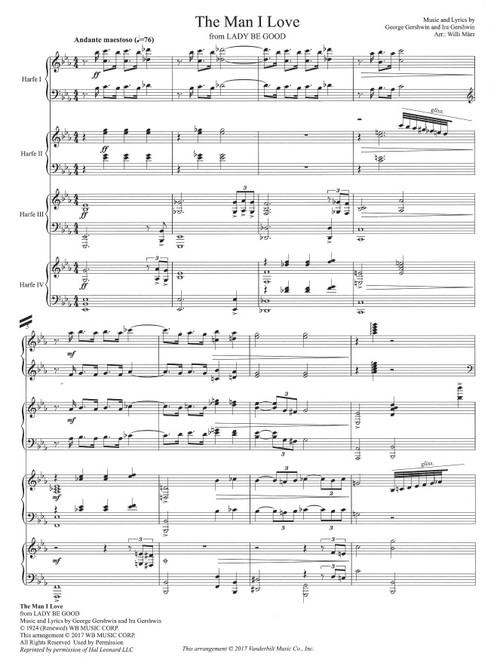 Description The Man I Love by George Gershwin. Arranged for harp quartet by Willi Maerz. Score and four harp parts included.