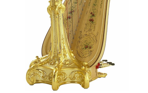 “Without a doubt, the highest expression of the harp maker’s art,” reads a description of the 1916 Lyon & Healy harp that inspired today’s glorious Louis XV Special concert grand harp. This masterpiece is superbly crafted, intricately carved and clad in lavish 23+ karat gold leaf. Inspired by the rococo style seen in French King Louis XV’s time, the harp conveys a light yet elaborate style of art, incorporating leaves, flowers, scrolled feet and shapes reminiscent of shells. Clear and resonant, it truly has the Lyon & Healy sound and carrying ability. The Louis XV Special has elaborate carving along its neck and kneeblock, as well as intricate carving along the soundboard edges, both on the sides and surface. The Louis XV Special is available with a distinguished Maple or exotic Bubinga veneer. An exquisite floral trellis design hand-painted on the soundboard using 23+ karat gold leaf. As a Lyon & Healy Special Instrument, the Louis XV Special comes with a unique miniature etching of a Lyon & Healy concert grand action plate design on the inside of the soundboard, a richly engraved, previously retired front action plate as well as an engraved back plate, a transport cover set and an extended 10-year limited warranty.