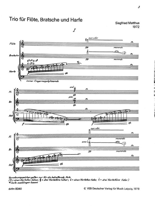 Trio for Flute, Viola and Harp by Siegfried Matthus. 1972. 25 page score. Score only. Parts not included.