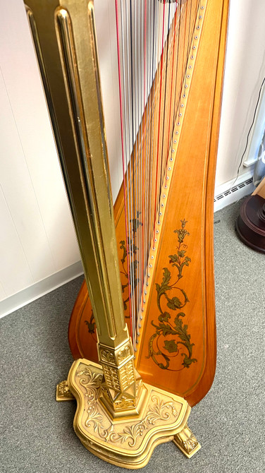 on the column, base, baseboard and feet. The harp has newer strings and can be regulated upon request for a full price