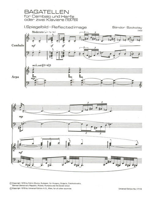 Description Bagatelles for Harp and Harpsichord, by Sandor Szokolay. (ADV.) Includes two copies of the score.